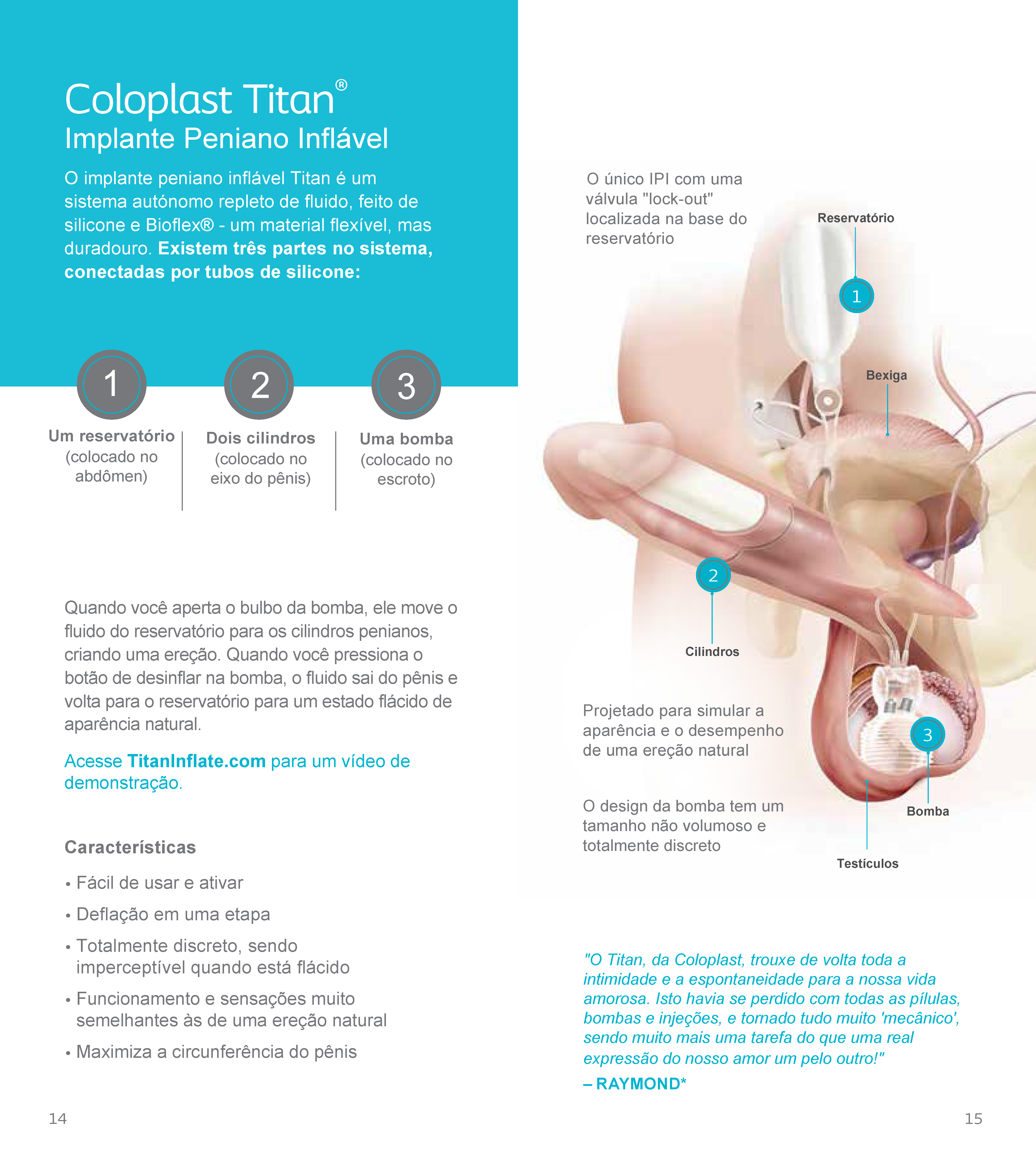 The 3-volume inflatable penile prosthesis Titan® is a self-contained system filled with saline and made of silicone with a Bioflex covering. Bioflex is a flexible yet durable biopolymer material. It is designed to mimic the appearance and performance of a natural erection. The implant provides voluntary control over the states of penile erection and flaccidity with a release activated at a touch. The Titan is designed for easy patient training, easier deflation of the device, and a quicker return to the flaccid state. (cf. 1,4)