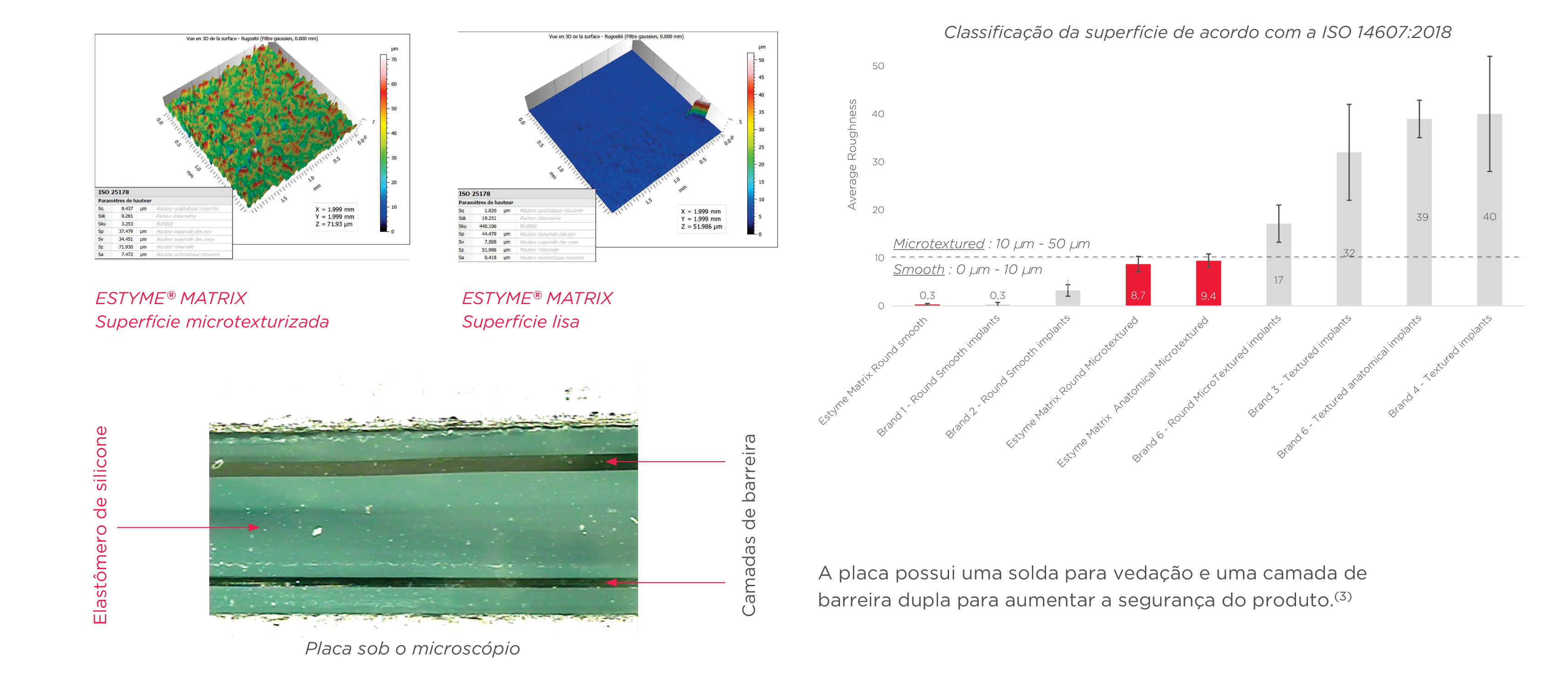 A PLACA possui uma solda segura e uma camada de dupla barreira para aumentar a segurança do produto. A identificação do fabricante, o número de série e o volume são gravados na placa de cada implante.